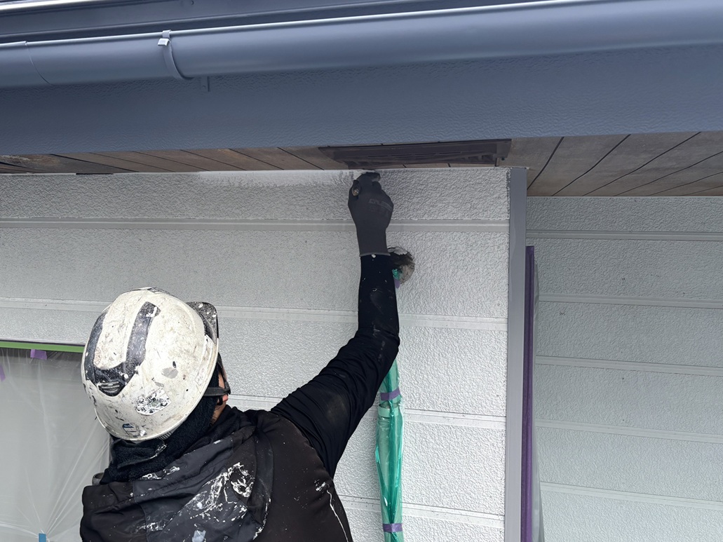 【下塗り】外壁の劣化が著しく進行している部分は、塗料が定着しにくくなります。そのため密着力の高いシーラーを塗布してから、種類の違う下塗り塗料にて部分的に2回下塗りを行いました。