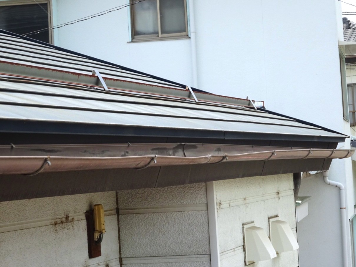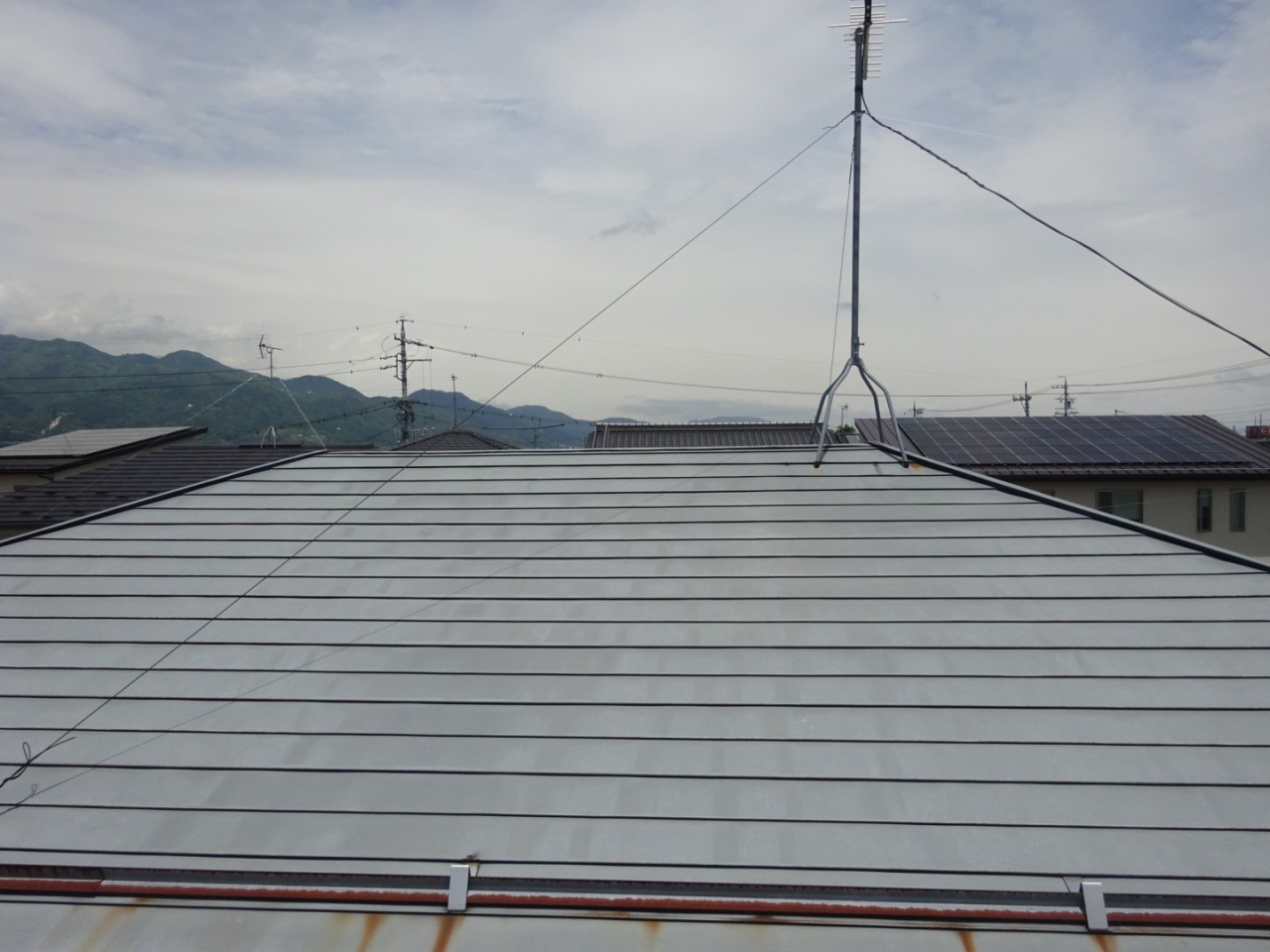 【施工前】屋根は金属屋根で、塗膜の褪色が進み、雪止めやアンテナ架台付近にはサビの移りがありました。放置すると錆びはどんどん拡大していきます。