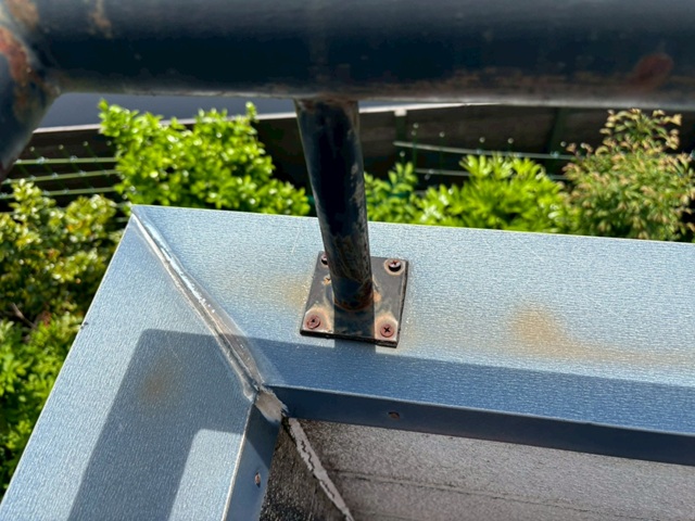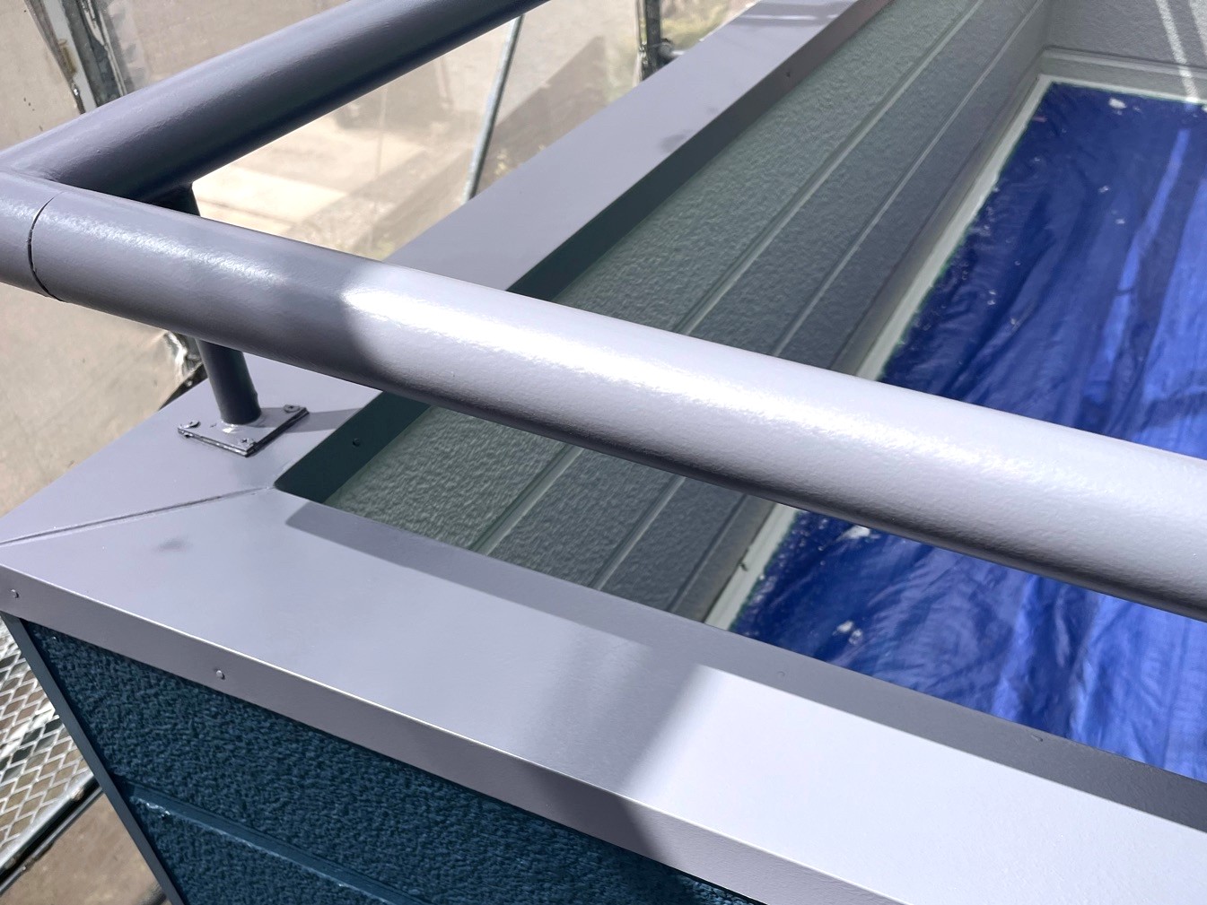 【中塗り後】手すりを固定しているビスも錆びていたため、ステンレス製ビスに交換し、さらにコーキングで防水処理を施しました。将来的な水の侵入を防ぎます。