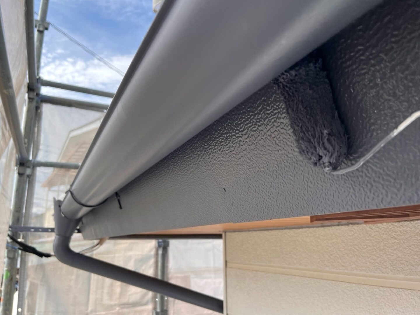 【破風中塗り】既存の軒樋を撤去し、新たに雨樋を設置しました。勾配調整も適正に行い、雨水が滞りなく流れるよう仕上げました。