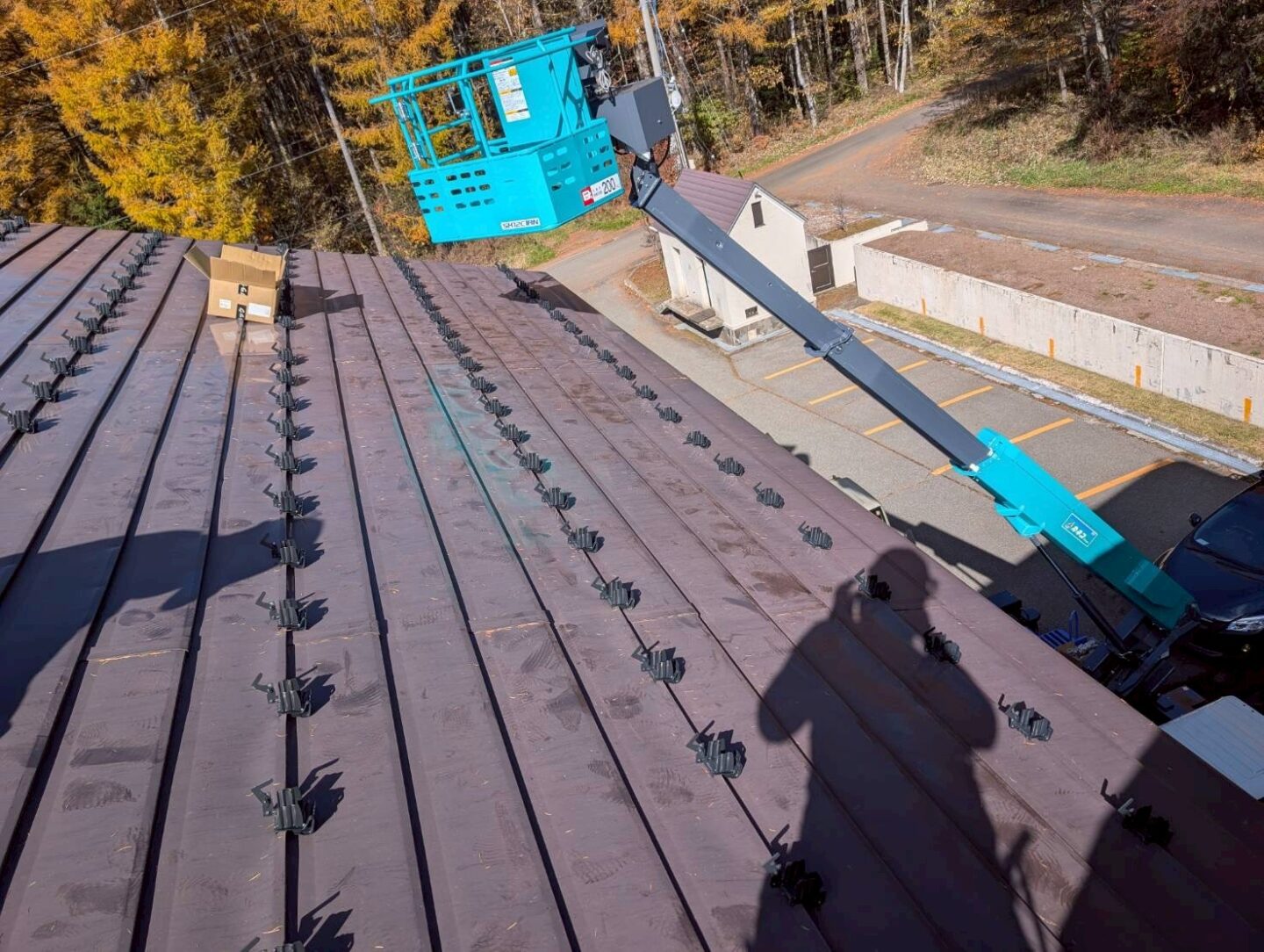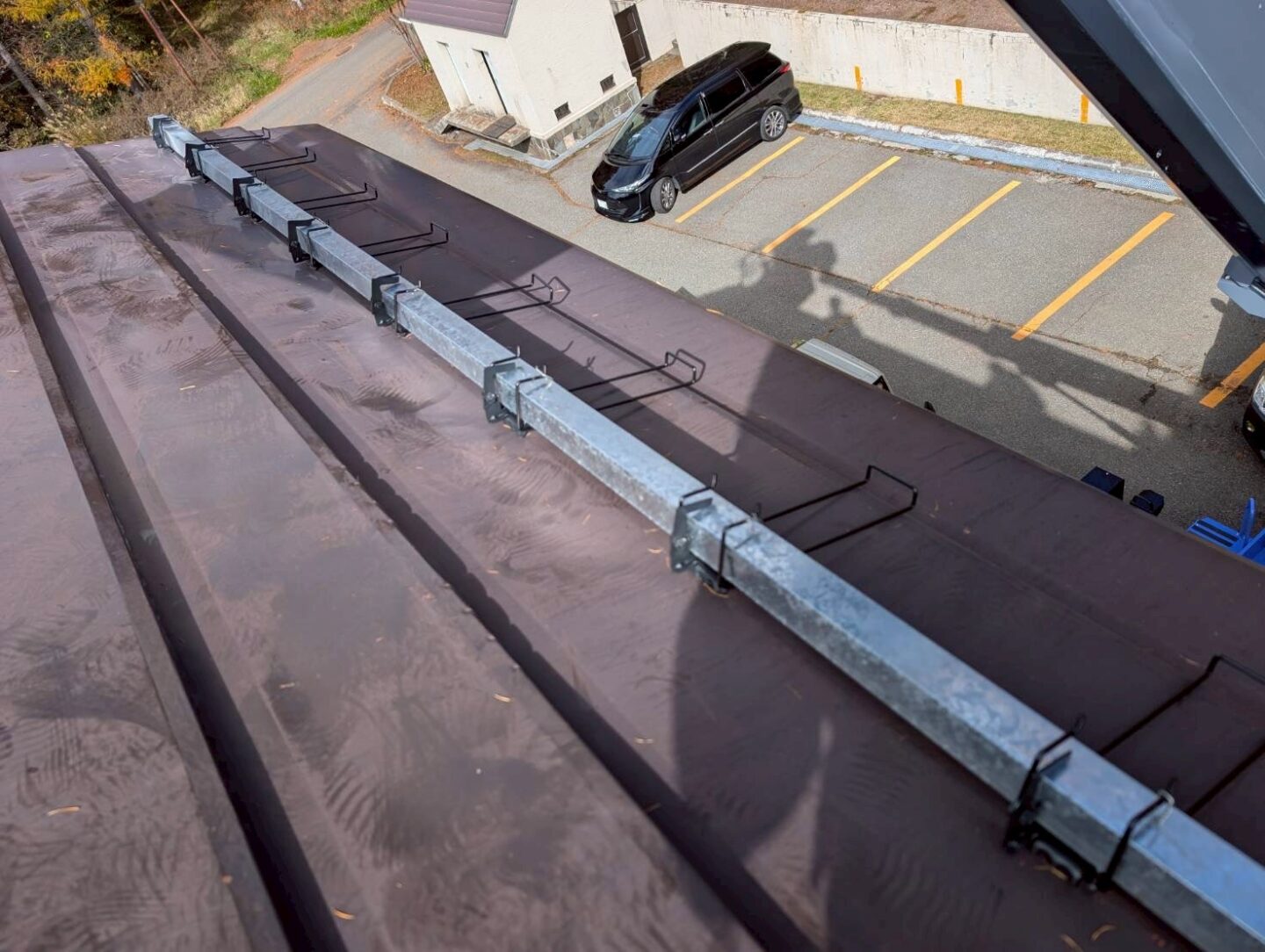 冬場は湿った雪が多く、一度に落ちると大きな衝撃になるため、入居者様の安全と車の保護を目的に雪止めの設置をご希望されていました。