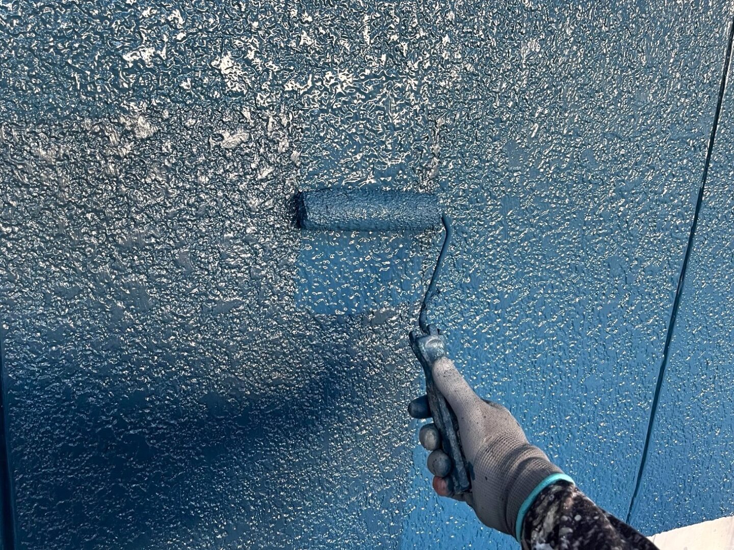 【下塗り】下塗りには柔軟性の高い塗料を使用し、乾燥後も柔らかく建物の動きに追従するため、今後のひび割れリスクも軽減できます。厚膜で塗れる下塗り材を採用したことで、凹凸のある外壁でもしっかりとカバーすることができました。