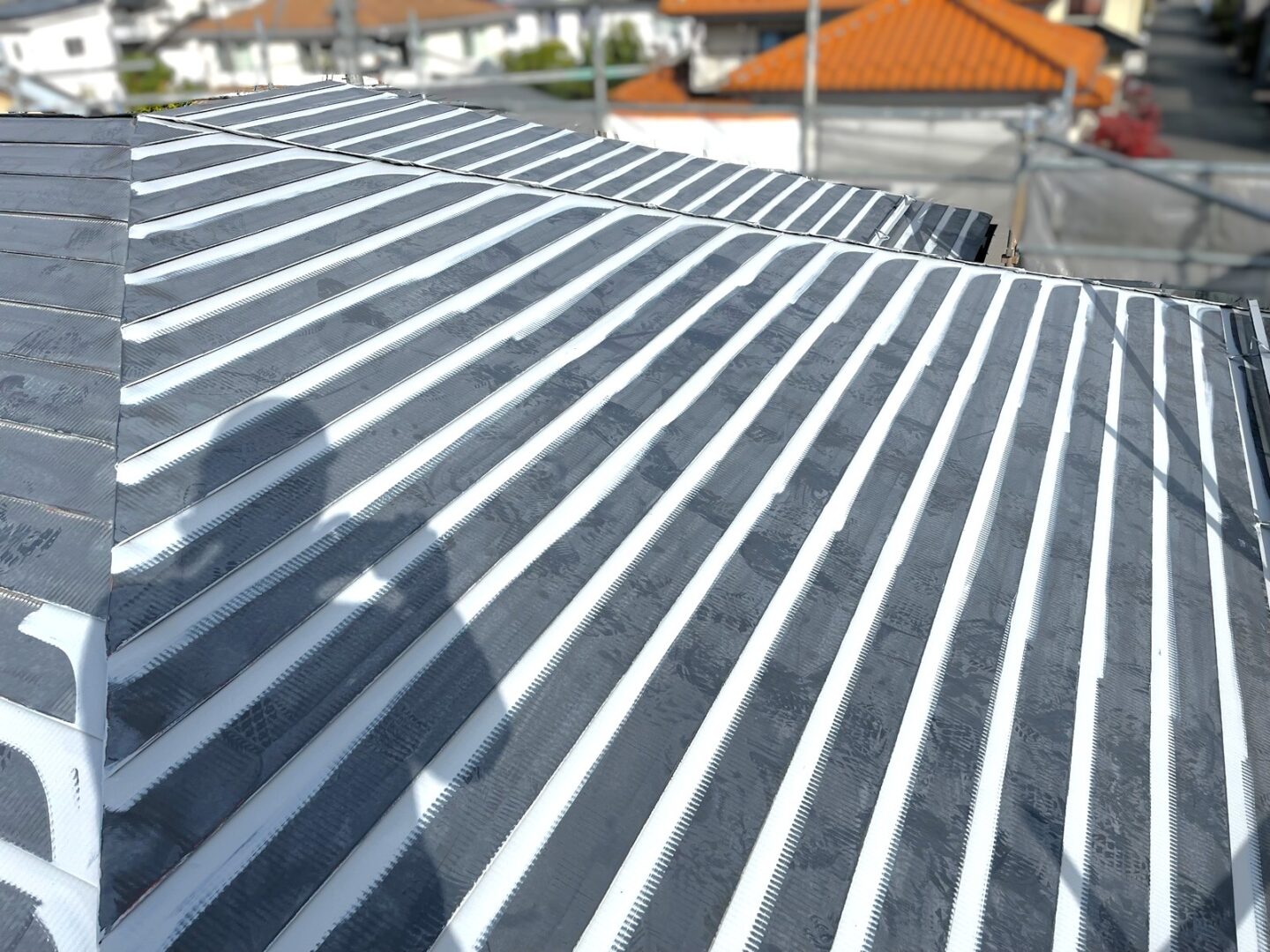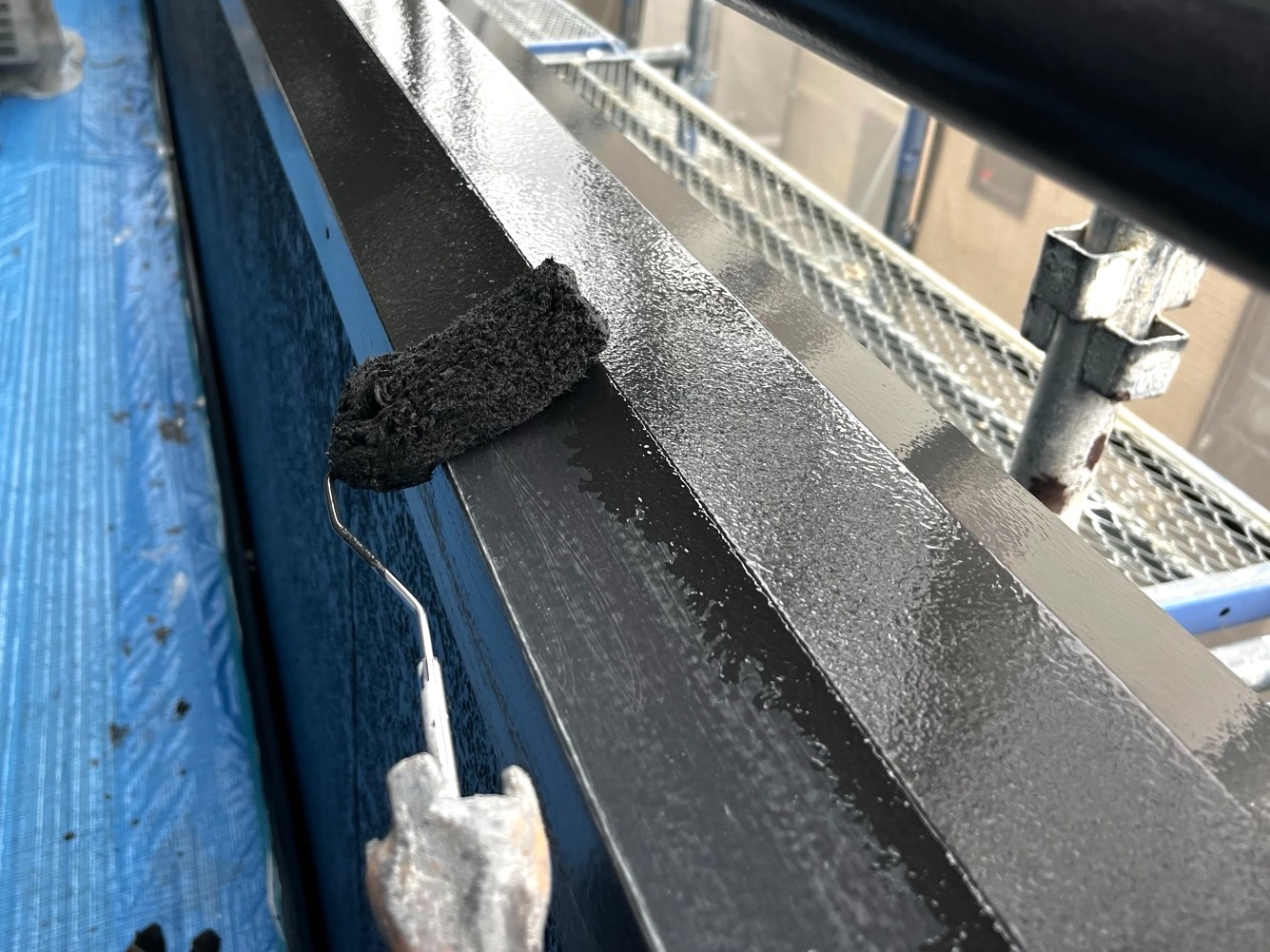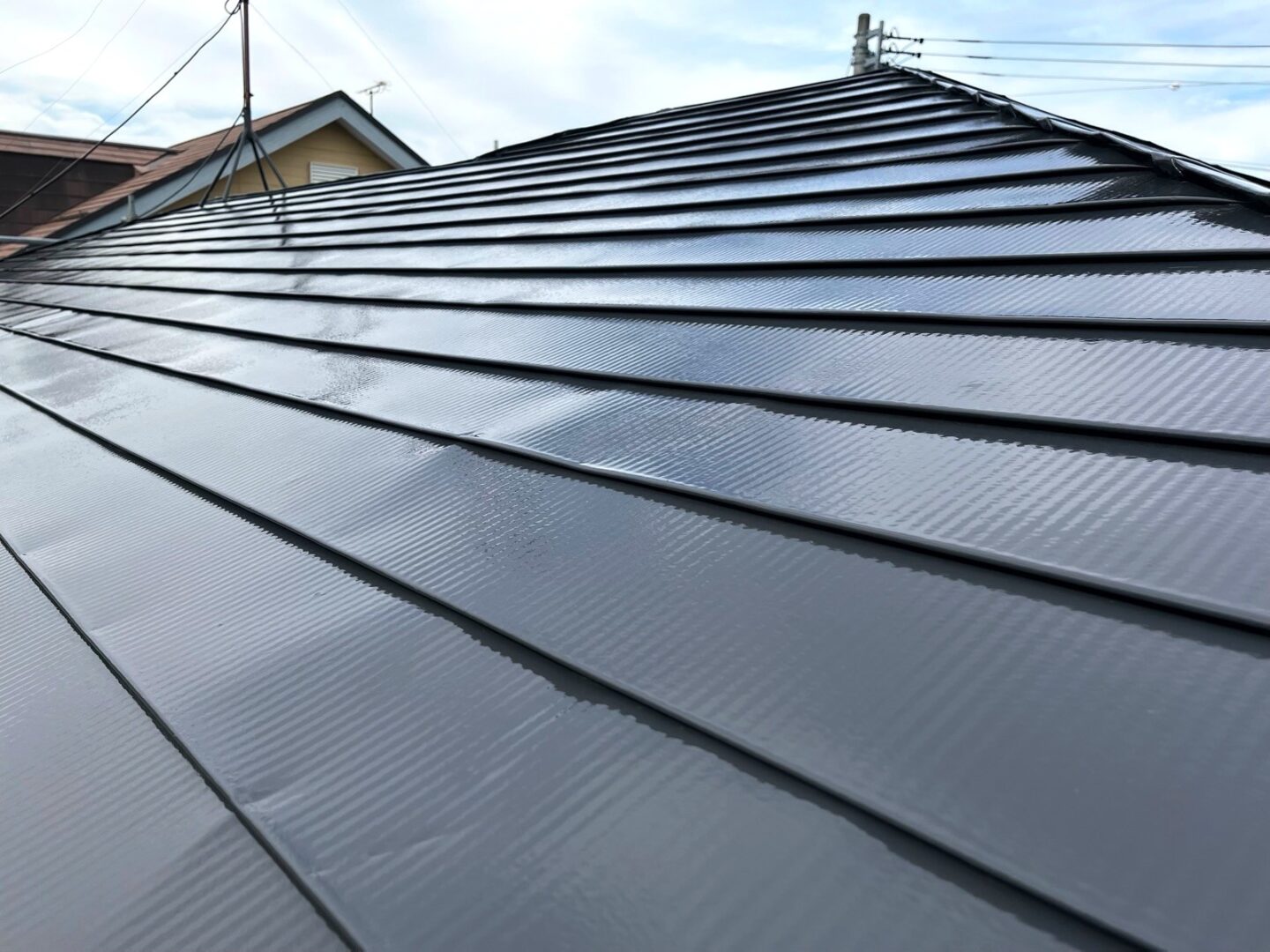 【上塗り後】屋根色は濃色をご希望でしたので、遮熱性の高い塗料を選ぶことで、夏場の室内温度上昇を抑える効果も期待できます。美観の持続性と防水性にも優れ、長い目で見てもメリットの大きい塗装となりました。
