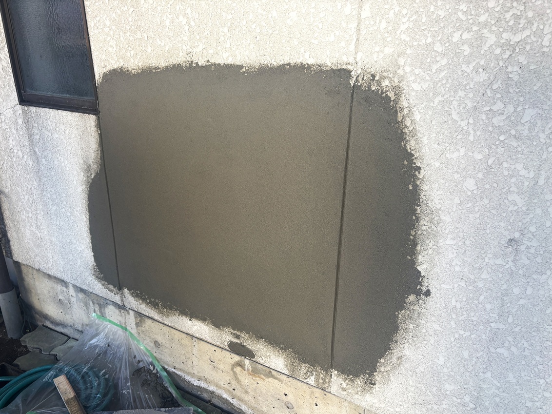 【ひび割れ補修後】ひび割れ部分を丁寧にカットして形を整え、内部にエポキシ樹脂を充填することで再発を防ぐ補修をご提案しました。その後、左官工事で表面を平滑にし、既存の壁と同じ模様を付けてから塗装することで、補修跡が分からない自然な仕上がりを実現しています。