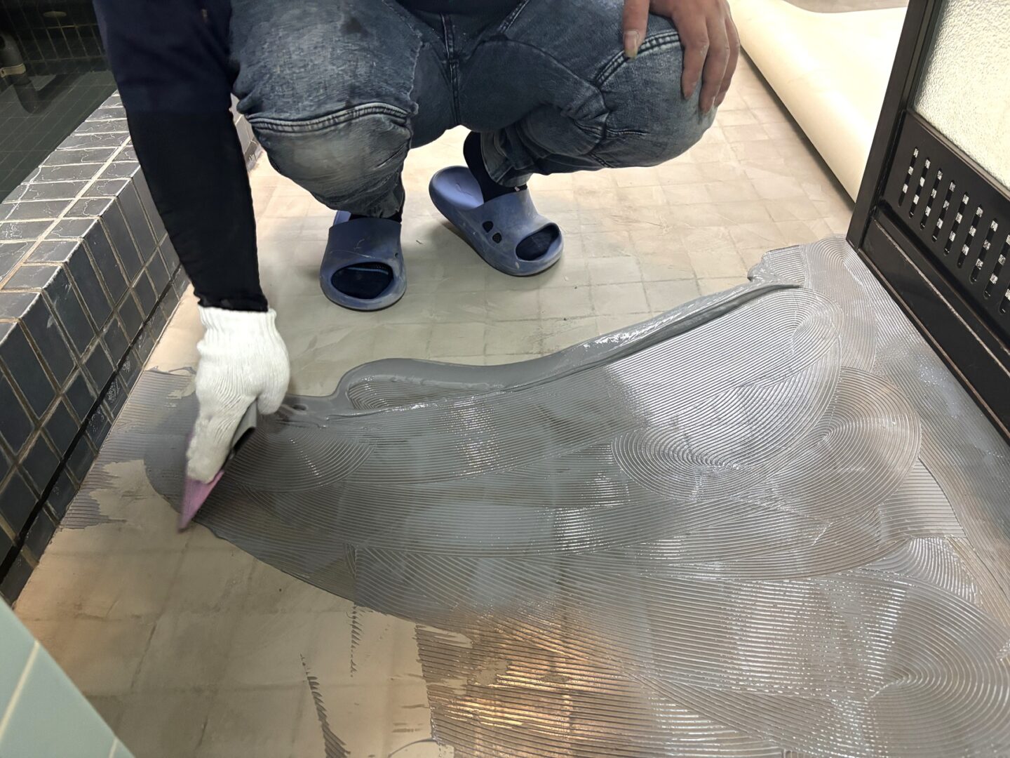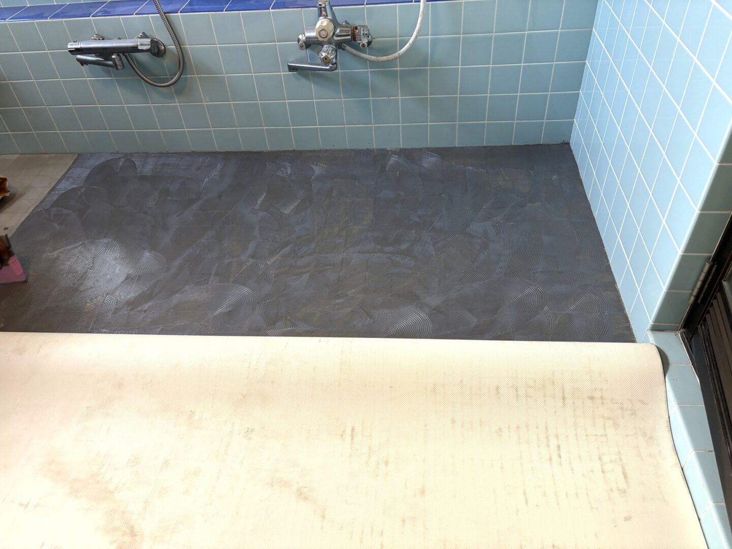 【接着剤塗布】浴室用床シートを貼る接着剤を塗布していきます。