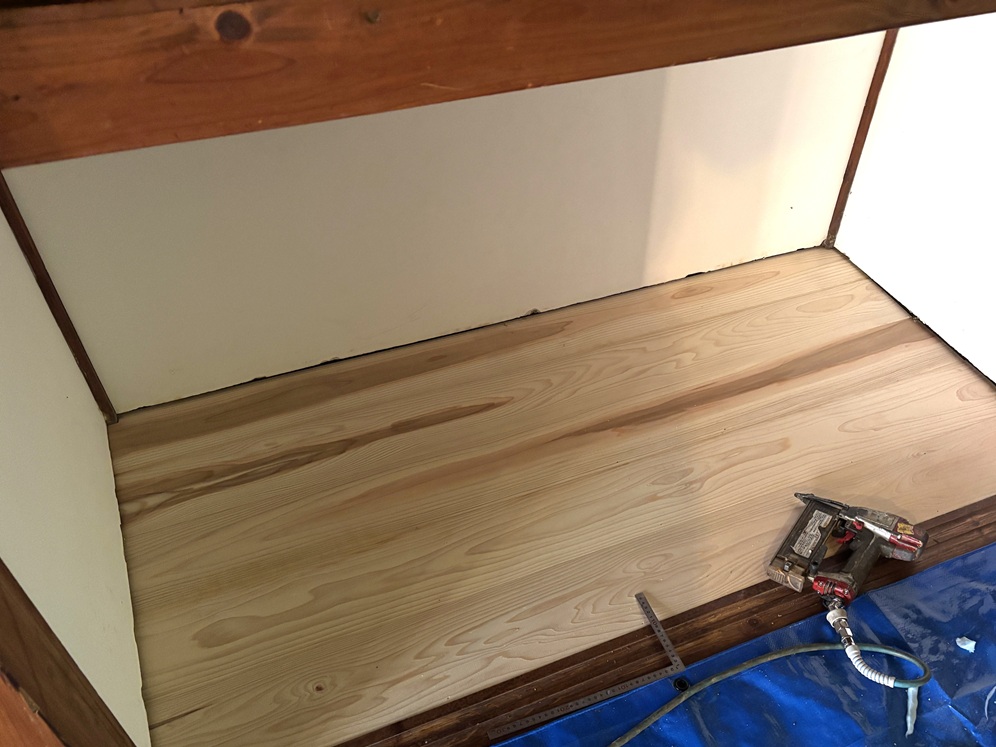 その後、床板と雑巾ずりを張り、木部専用の塗料で塗装しました。