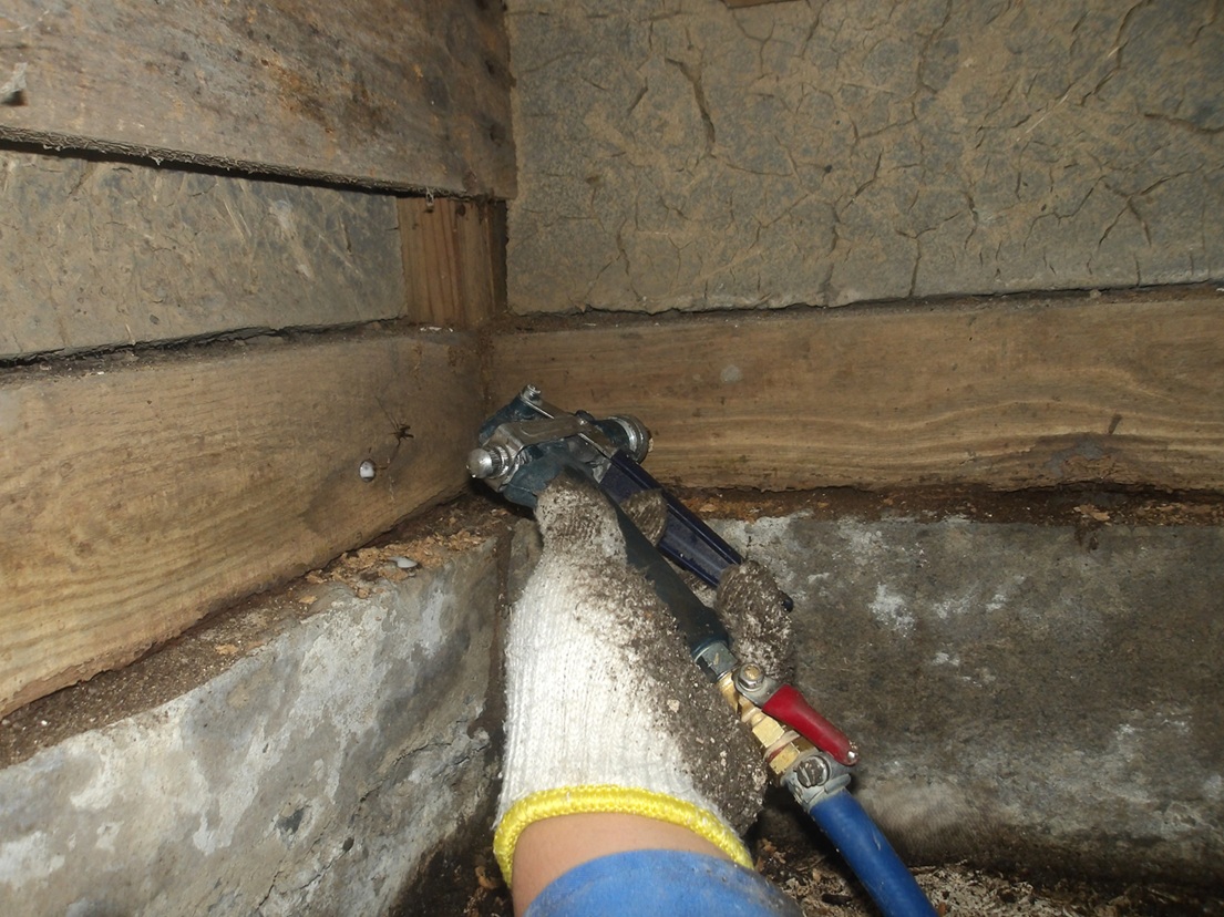 床下の木部と土壌には薬剤を散布し、防腐と防蟻の両面で処理を行いました。